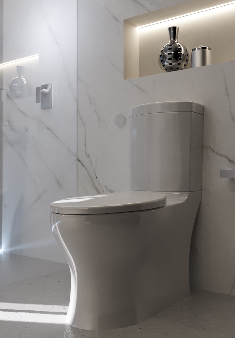 ●Innovación minimalista: Agrega lavabos e inodoros diseños delgados con acabados en cromo y negro mate que combinan elegancia con sostenibilidad al reducir el consumo de agua, como el OP Capri Plus con un botón accionador y cuatro jets para una limpieza total.