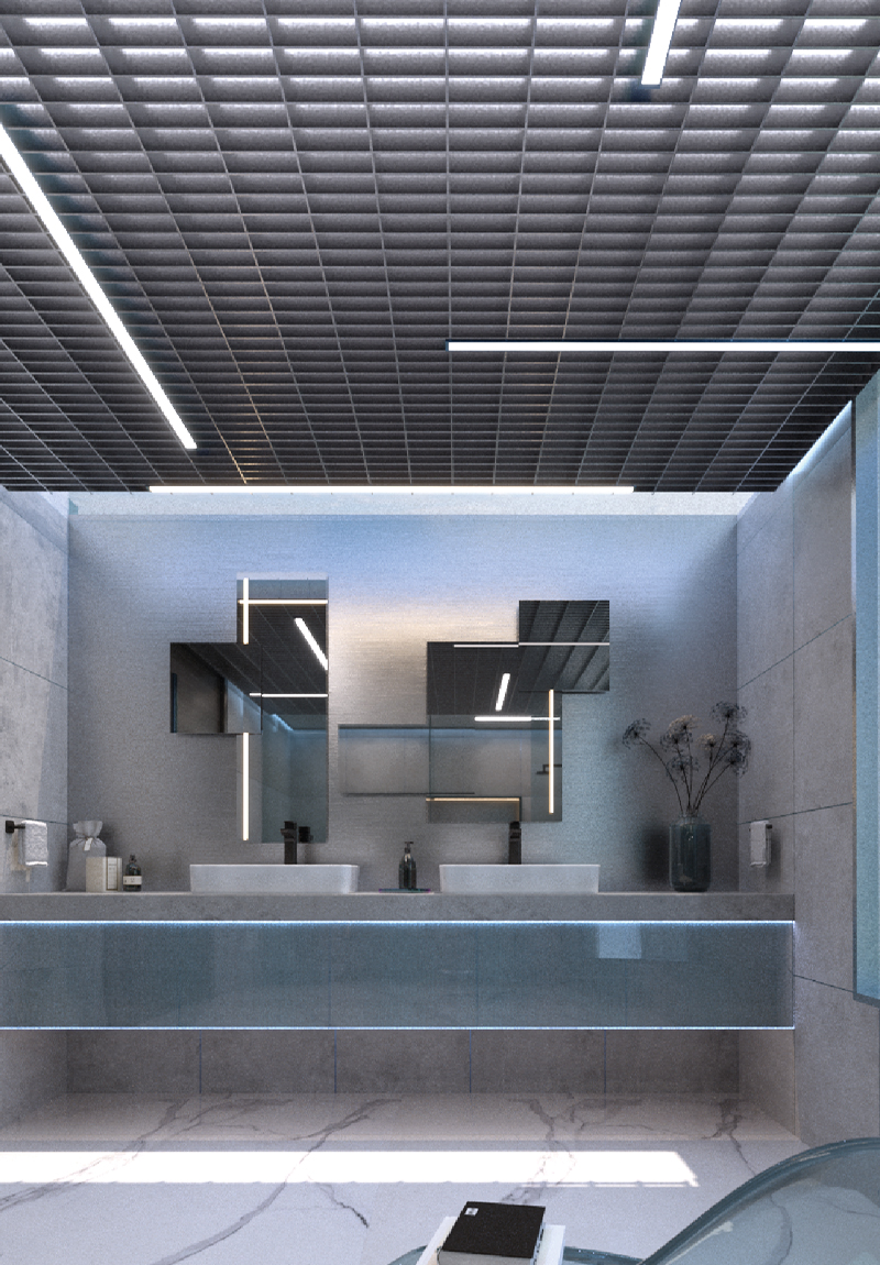 Destacar elementos: utiliza luces direccionales para destacar características específicas del baño, como una pared de azulejos decorativos, una pieza de arte o plantas. Esto puede agregar un toque de sofisticación y profundidad al espacio.
