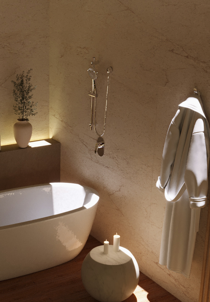 ●Grifería y duchas: Elige regaderas con efecto lluvia o masajeador para una experiencia más relajante.