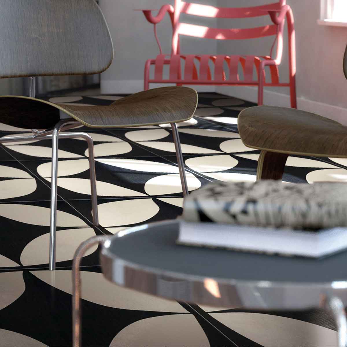 La base blanca de gres porcelana se convierte en el papel sobre el que dibujamos, simulando un efecto de relleno manual.
